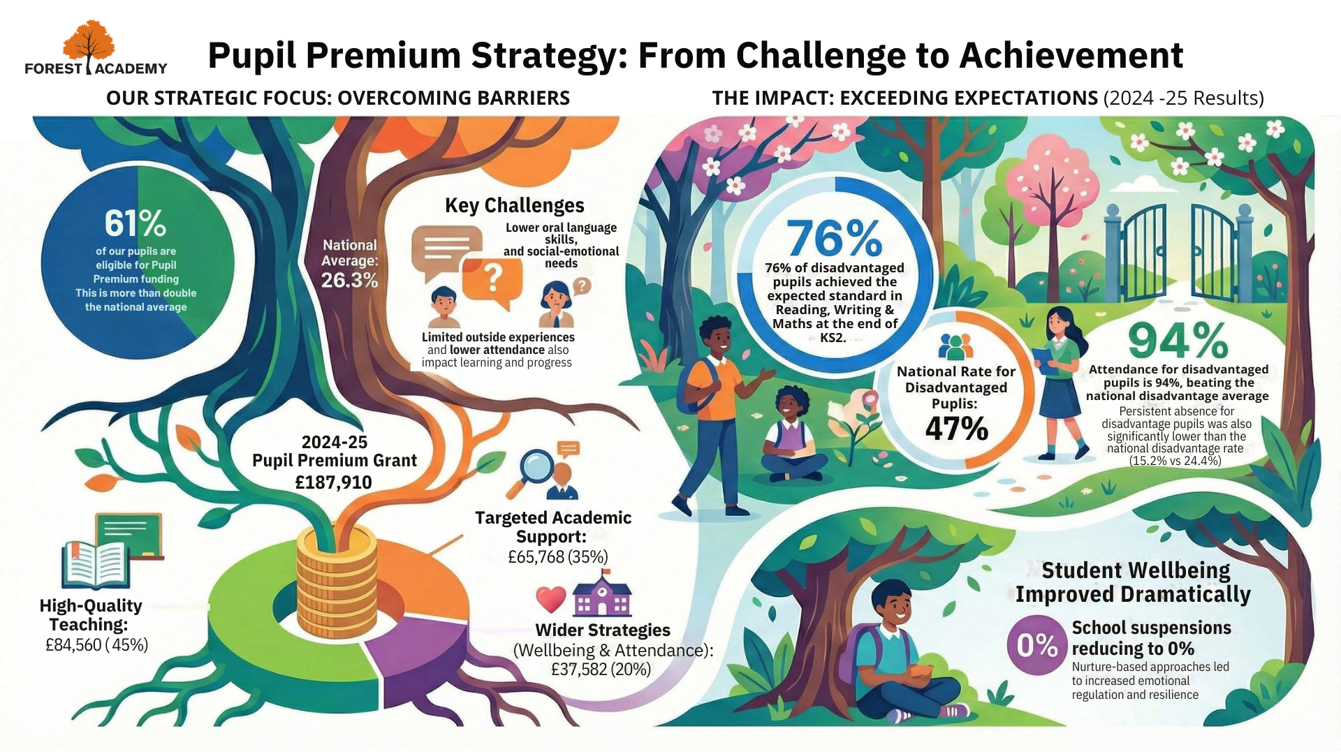 At Forest Academy, we use this resource to remove barriers, strengthen teaching, and ensure every child has the opportunity to thrive. The visual below summarises the key challenges faced by our pupils, how the funding is allocated, and the strong impact seen in attendance, wellbeing and academic achievement.